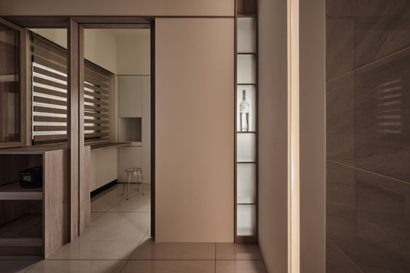 The dining and kitchen area features a glass-wood design for the kitchen sliding door to block kitchen fumes, extending the visual axis of the living room and the entrance hallway. Through the interplay of light and shadow, a special angle and narrative context are created.