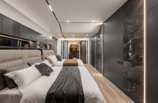 From the entryway, light unfolds the atmosphere layer by layer. A translucent marble wall, “Angel’s Wings”, greets the entrance with a soft, glowing presence. Its light reflects across mirrored ceilings and stone flooring, casting a welcoming ambience that gently transitions from the outside world into a calmer inner world. Stepping into the living room, the main wall clad in stone establishes a grounding foundation. Overhead, light flows along gentle arcs, weaving with the wall textures to create a layered space. The interplay of light and shadow flows effortlessly into the dining area, shaping an immersive atmosphere where shifting glow guides movement from one zone to the next, and daily life unfolds in quiet warmth. At the junction of living and dining rooms, a concealed door, “Ocean of the Moon”, echoes the central chandelier. Beyond hiding the restroom entrance, it enriches the narrative, creating a space that tells the story. Along the dining room’s wall, a cabinet that displays wine bottles inspired by Chinese zodiac signs comes into view. Here, metal, glass, and mirrored surfaces intertwine, composing a scene that is both refined and quietly grand, transforming the owner’s passion into a beautiful view within the home.