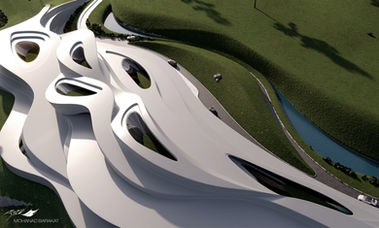 The structure flows with a biomorphic elegance, suggesting a building that breathes, moves, and harmonizes with its natural surroundings. Its undulating contours and layered masses represent the energetic flow found in cellular structures, while the skylight openings evoke cellular vacuoles allowing natural light to penetrate the interior softly.