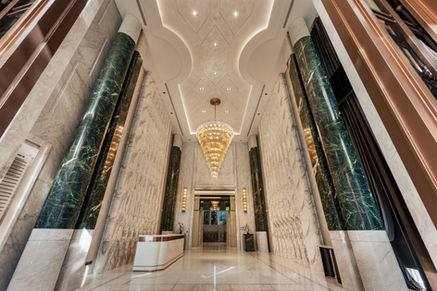 Within the soaring atrium, green natural stone columns stand proud and tall like trunks of a forest, embodying rooted growth and lasting vitality. From the center descends a cascading crystal chandelier, flowing like a luminous waterfall, a wellspring of energy that infuses the heart of the tower with the rhythm of life.