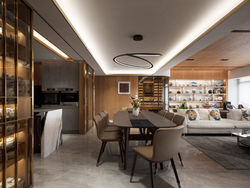 As one navigates through the open layout, the transition from solid walls to a striking open display wall behind the sofa and a chic glass wine cellar introduces a sense of transparency and flow. This rounded design language extends gracefully to the ceiling, linking sightlines and enhancing the overall sense of fluidity throughout the space. Positioned at the very heart of the home, the dining area presents a sophisticated dark wood table, artfully paired with a captivating circular pendant light. The combination of recessed lighting and thoughtfully designed display cabinets creates a dynamic living scene, seamlessly balancing the joys of social entertaining with the appreciation of art.